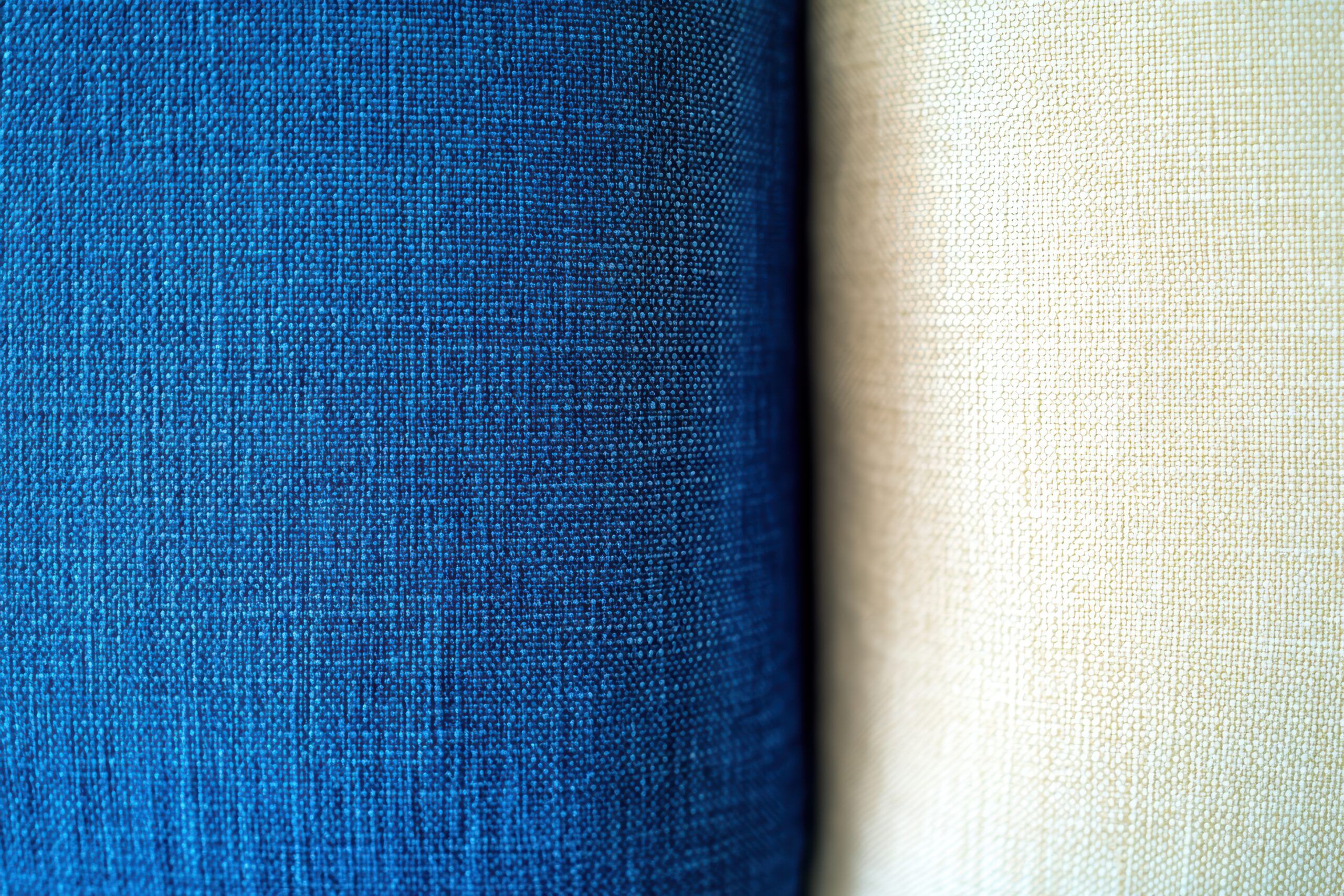 Close-up view of textured blue and cream fabric rolls in interior design setting