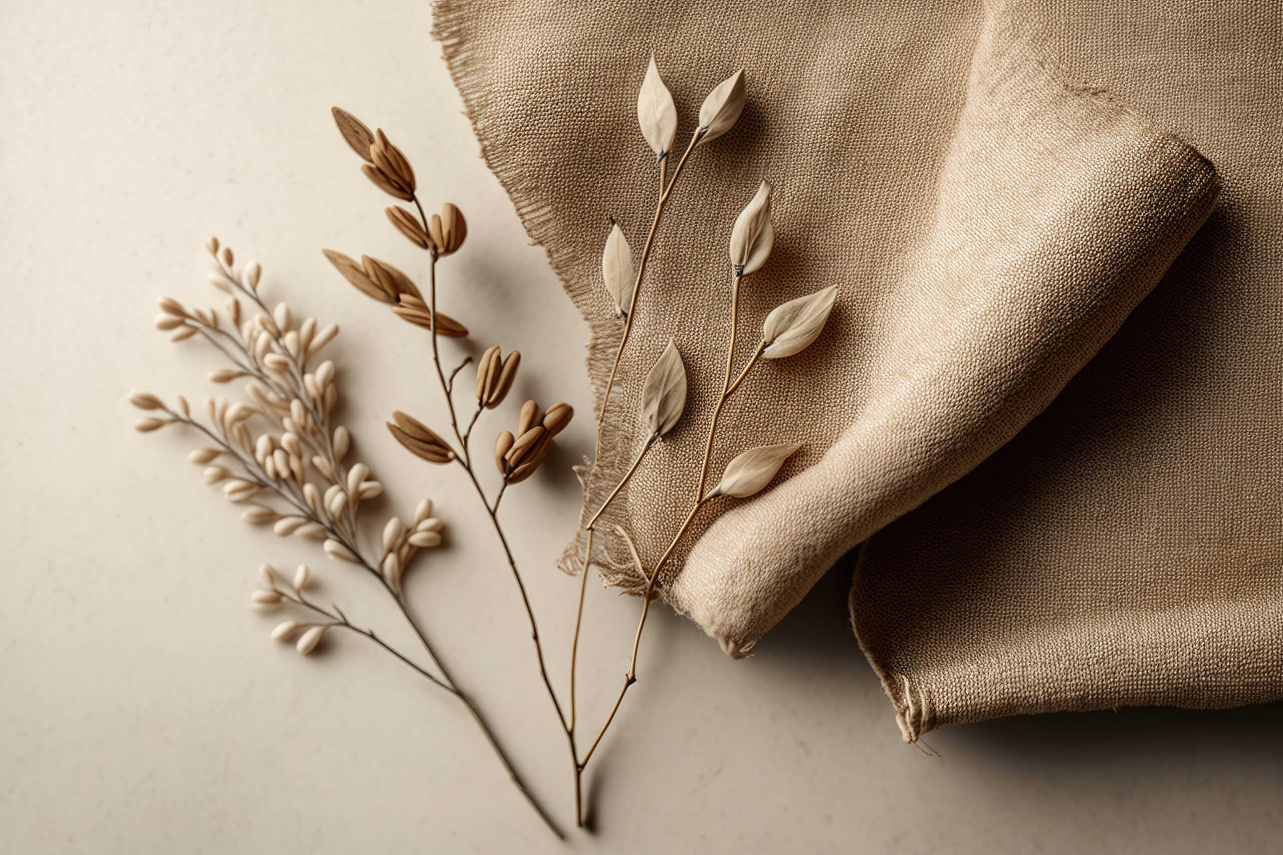 Dry plant on linen fabric background. Illustration AI Generative